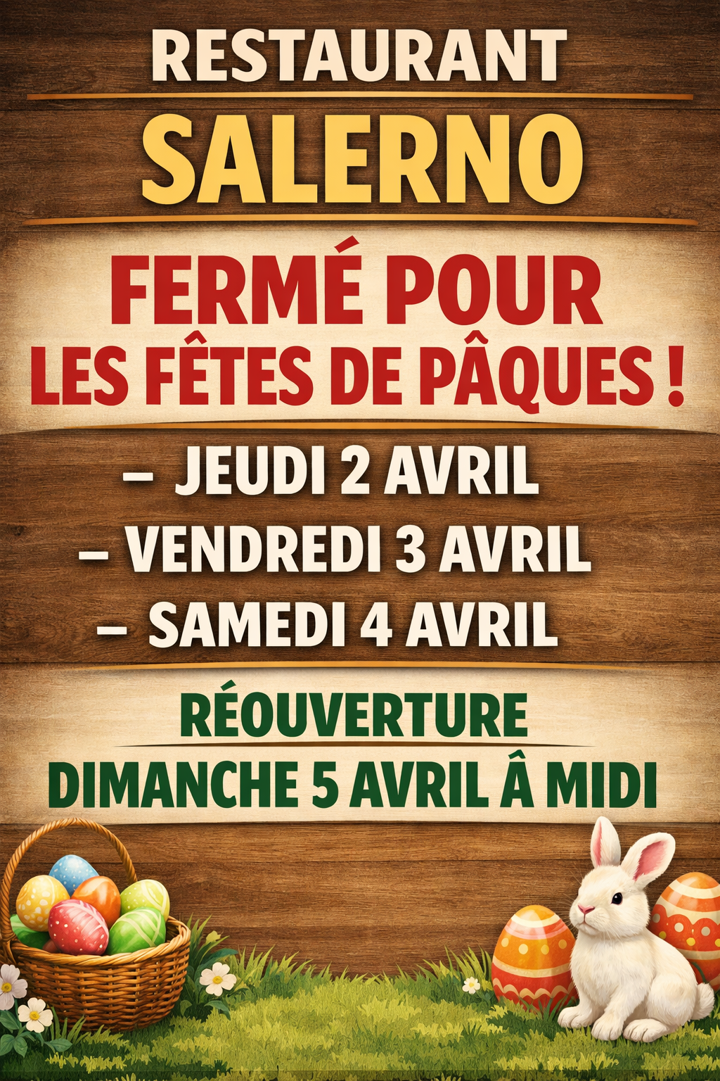 Chers clients, chers amis, Le restaurant Le Salerno sera fermé à partir du lundi 23 décembre au soir jusqu’au dimanche…